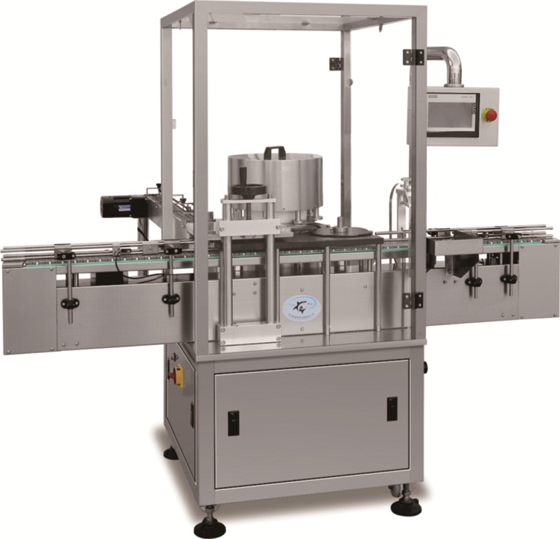 其工作原理是电动机通过传动带、蜗轮减速器带动主轴旋转。从而带动了转动体和压盖头座的旋转。随着转动体的旋转,使安装于转动体内的升降托盘在托盘凸轮的控制下坐上升运动,进入倒升降托盘的瓶子亦被向上顶起,与同时进入到该位置的盖子一起向上运动,在压盖头的作用下使瓶子与盖子压紧,而随着转动体的继续旋转升降托盘在托盘凸轮的控制下做下降动作,使已压盖的瓶子下降至出瓶平面。